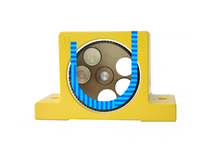 振動由轉(zhuǎn)子的正、負(fù)轉(zhuǎn)矩的不平衡而引起的離心力產(chǎn)生。轉(zhuǎn)子由一對重型預(yù)潤滑帶防塵圈的球軸承支承,特制的潤滑脂確保證其工作壽命。